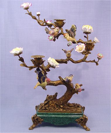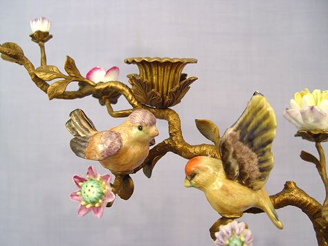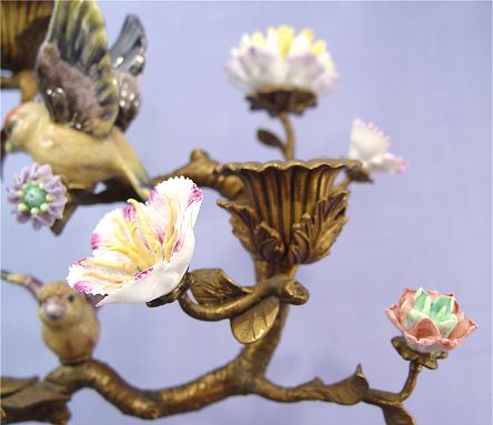 3 LIGHT FIGURAL CANDELABRA: Decorative antique style featuring porcelain birds and flowers on an ornate gilt metal base. 14''h.