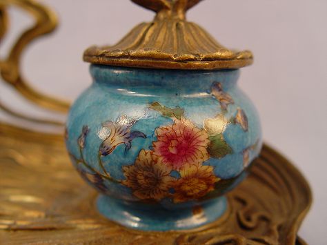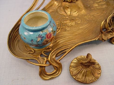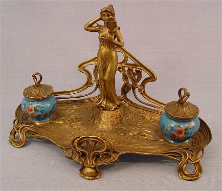 ART NOUVEAU STYLE FIGURAL INK STAND: Double porcelain ink wells centering a 6 3/4'' maiden. 8 1/2''h. x 14'' x 8''.