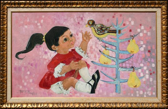 BLEE, Barbara, (American, 20th C.): Child with Partridge? in a Faux Pear Tree, O/C, 17 3/4'' x 29 1/2'', signed, dated 1969, gilt frame, 22'' x 34''.