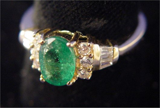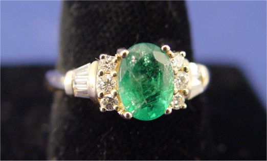 EMERALD AND DIAMOND RING: Oval cut emerald of good color, set in 14k yellow gold with six small round cut and six tapered baguette cut diamonds, approx. total weight 15pts, size 7, 3 grams. Est. $300/500**