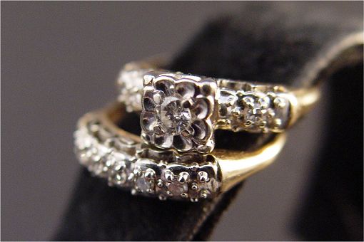 DIAMOND BRIDAL SET: 14k gold bridal set with yellow gold shanks and white gold tops holding the diamonds, approx. 20pts total of diamonds, size 4.75, 3.4 grams total.