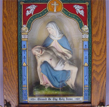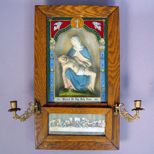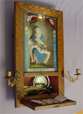 CATHOLIC SICK ROOM LAST RITES KIT IN OAK WALL MOUNT BOX: Reverse painted glass. With candles, crucifix and accessories. 23'' x 13 3/4''.