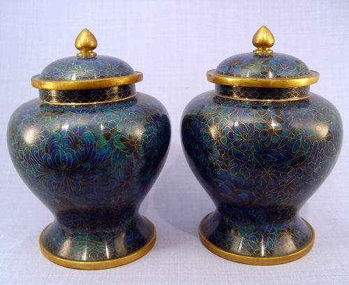 PAIR OF CHINESE BLUE CLOISONNE COVERED JARS: 9 1/2'' h., 7'' at the widest part of the body.