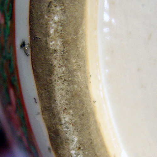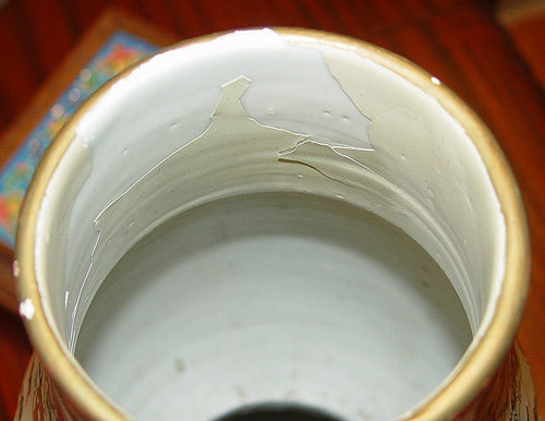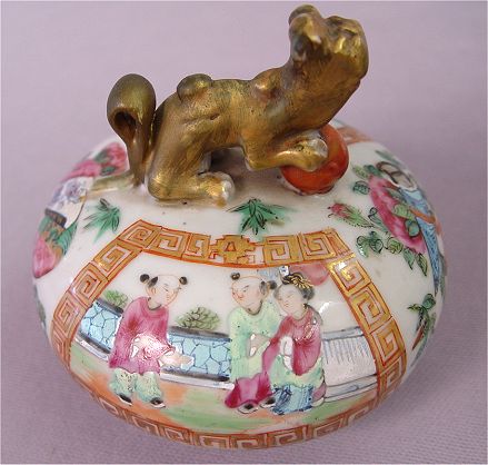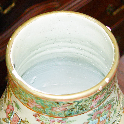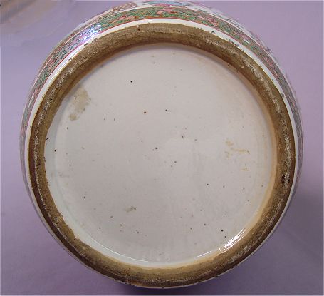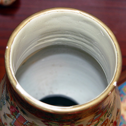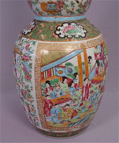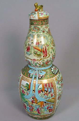 TALL CHINESE DOUBLE GOURD VASE: Polychrome with unusual blue ''ribbon sash'' at the neck. 23''h., plus a 3'' foo dog finial lid. Professional restoration visible on the interior.