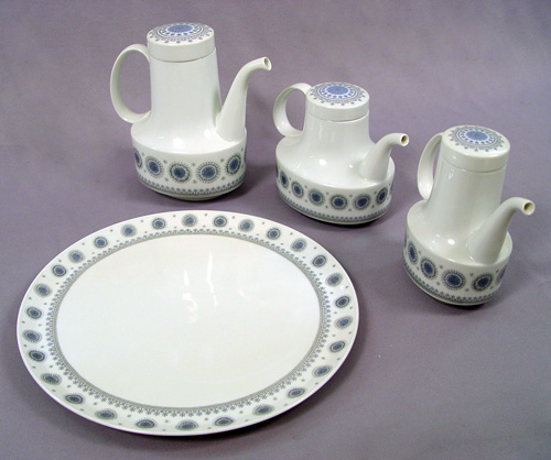 RETRO ROSENTHAL ICE BLOSSOM DESSERT / LUNCHEON SET: 44 pieces to include teapot, coffee pot, mini coffee pot, creamer, mini creamer, covered sugar, mini covered sugar, a 13'' round platter, 14'' rectangular tray, 12 salad plates, 7 3/4'' dia., 9 demi cups and saucers, 8 cups and saucers.