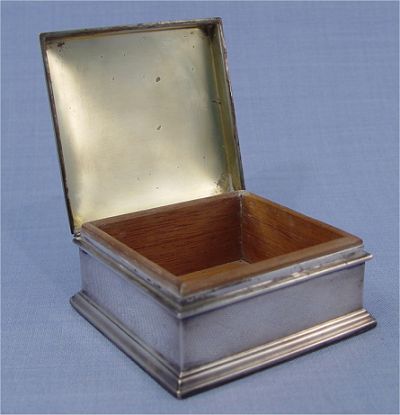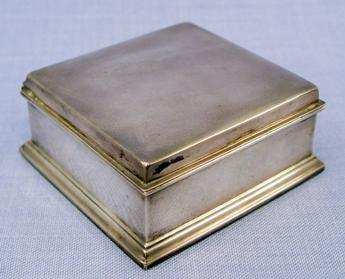 GORHAM STERLING BOX: Square wood lined dresser or desk box with hinged lid, approx. 3 3/4'' x 3 7/8'' x 1 1/2''h. Marked Gorham Sterling 315 to bottom, remnants of foil label visible.