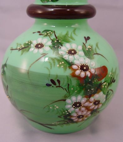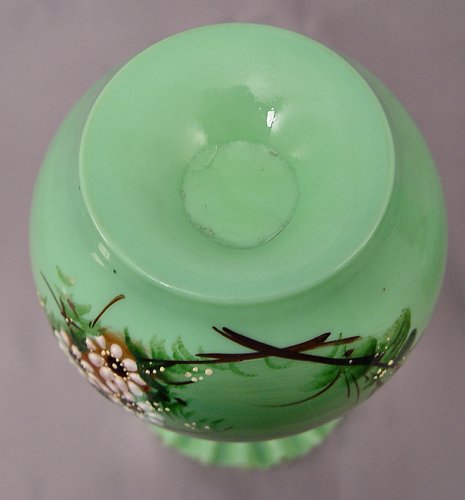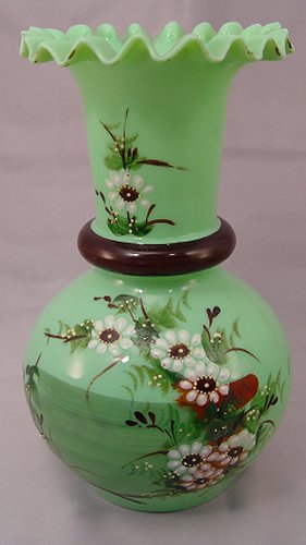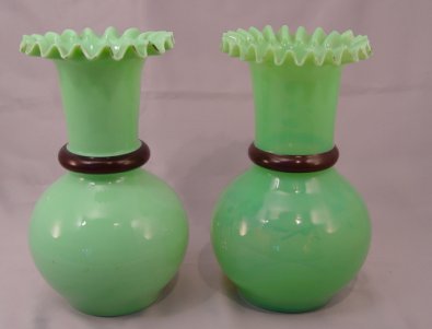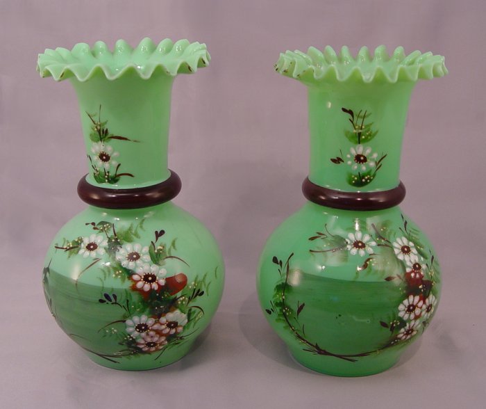 PAIR VICTORIAN ART GLASS VASES: Enameled green glass with a fiery opalescence when held to the light, 8'' h.