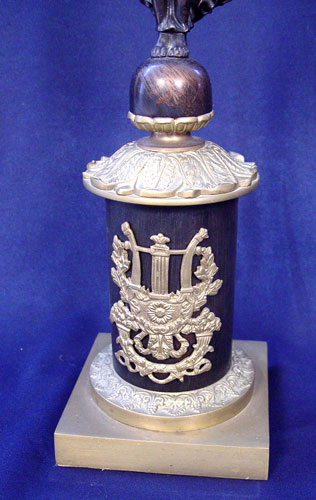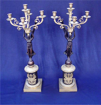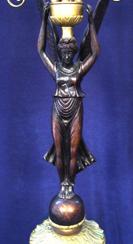FIGURAL WINGED ANGEL CANDELABRUM: Matched pair of contemporary candelabra, 5 lights supported by a winged maiden. Bronzed and gilt metal. 28''h. 11'' dia.