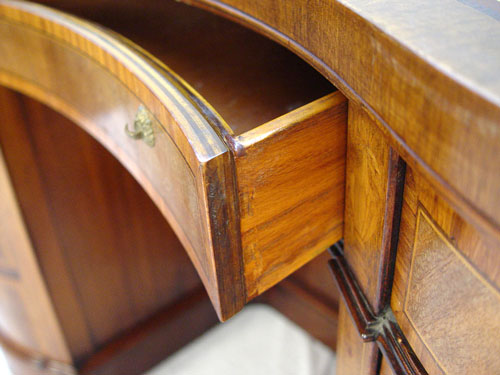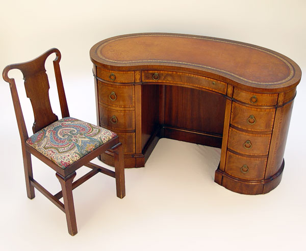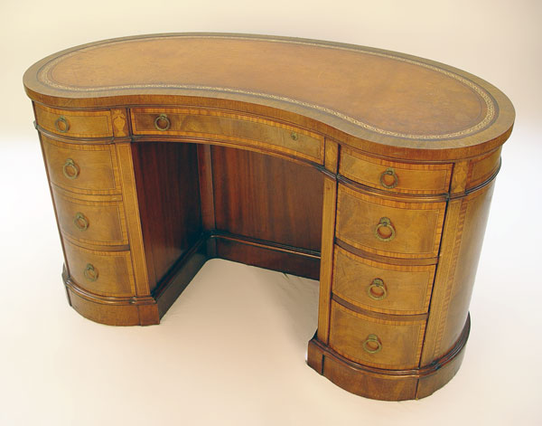BANDED AND INLAY MAHOGANY KIDNEY DESK BY SLIGH FURNITURE: Open book shelves on the back, leather top, 30'' x 51'', 22'' - 33''.