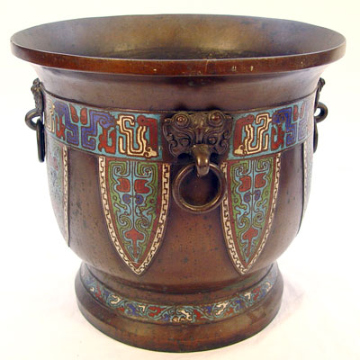 LARGE CHINESE CHAMPLAVE' JARDINIERE: With ring handles, 11 3/4''h. x 12 3/4'' dia.