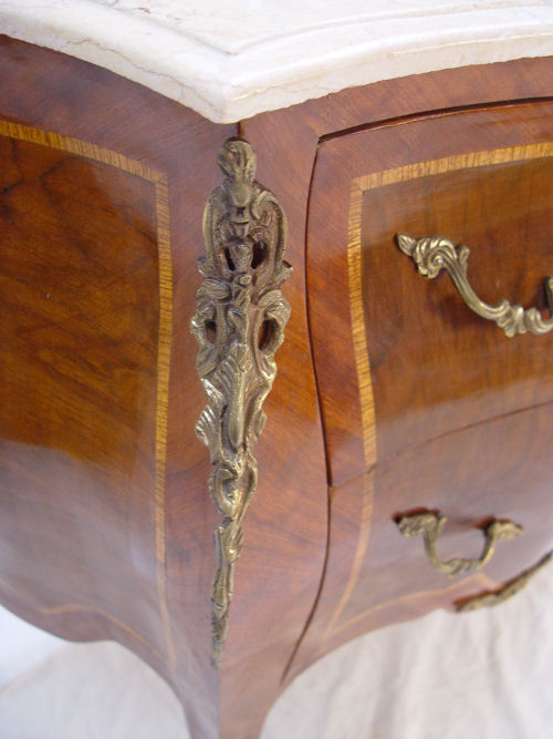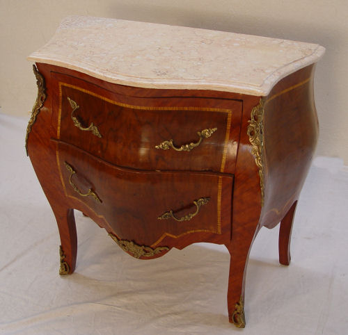 PINK MARBLE TOP BOMBAY STAND: Two drawer stand with inlay bands and ormolu decorations, light pink marble with beveled edge, late 20th C construction, 30 1/4''h., 32 1/4'' x approx. 18''.