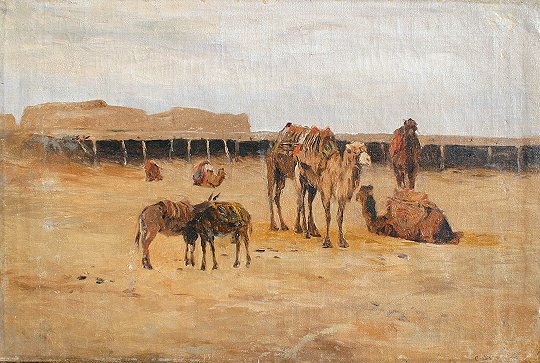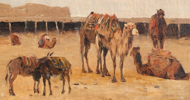 SVETOSLAVSKY, Sergei Ivanovitch, (Ukrainian, 1857-1931): Desert Landscape with Camels and Burros, O/C, 16 1/2'' x 25'', partial signature lower right. Older reline, sporadic inpaint with several abrasions, will clean up nicely. Est. $8000/12000**