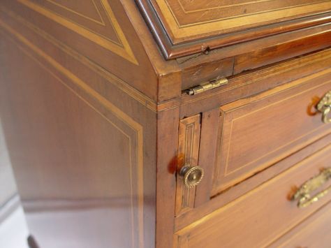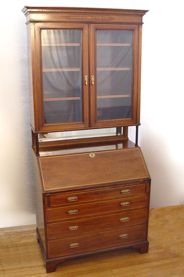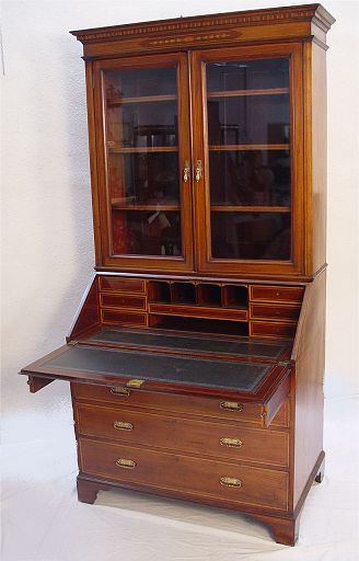 ENGLISH BUREAU BOOKCASE CABINET: Every edge outlined in satinwood string inlay. Under the molded cornice is a band of parquetry over a spray of bellflower. Upper section has adjustable shelves, lower case with fitted interior and leather writing surface, four full length drawers with ornate brass bale pulls. 80.5''h. x 38 3/4'' w. x 22 3/4'' Est. $3000/4500**