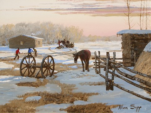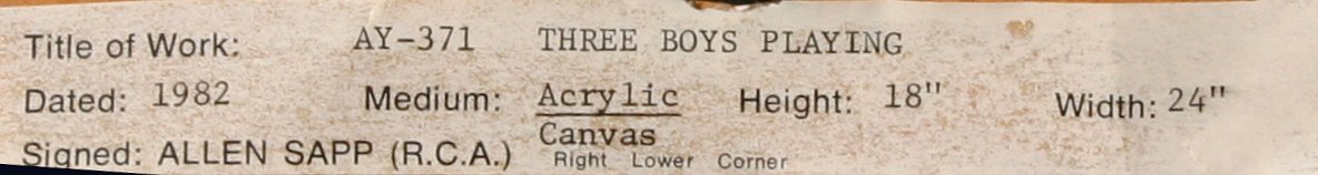 SAPP, Allen, (Canadian, 1929-): ''Three Boys Playing'', O/C, 18'' x 24', signed, label verso, gold frame, 28'' x 34''. Est. $2000/4000**