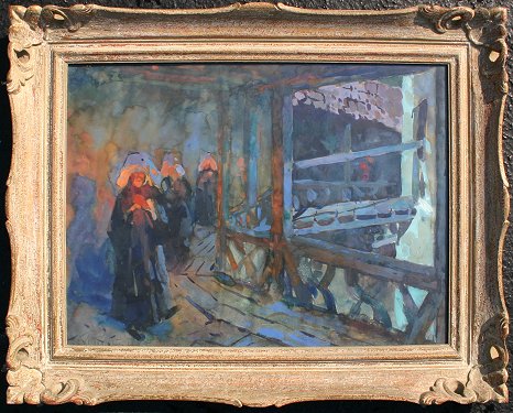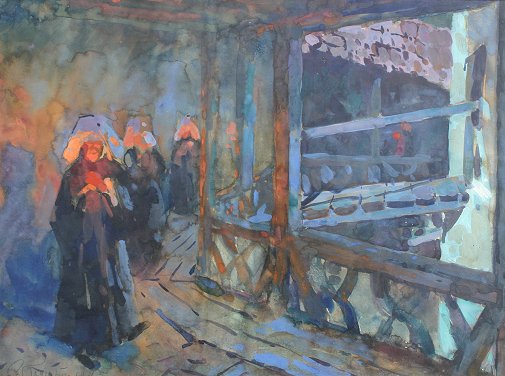 BONGART, Sergei, (Russian/American, 1915-1985): Nocturnal Procession of Nuns in Interior, Gouache, 16 1/2'' x 22 1/2'', pencil signed and dated 1945, gesso frame with wear, 22'' x 29''. Est. $1000/1500**