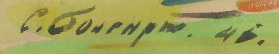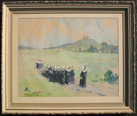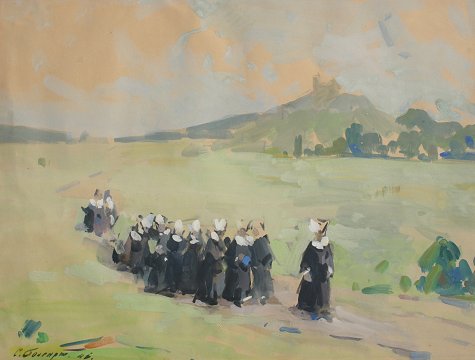 BONGART, Sergei, (Russian/American, 1915-1985): Nuns in Landscape, 18'' x 24'', signed in Cyrillic and dated '46, painted white frame, 25'' x 31''. Est. $1000/1500**