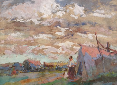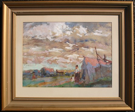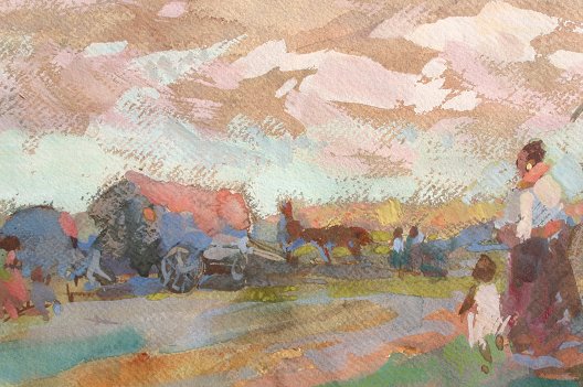 BONGART, Sergei, (Russian/American, 1915-1985): Landscape with Figures Horses and Haycart, Gouache, 13'' x 17 1/2'', unsigned, gold frame with wear, 21'' x 24 1/2''. Est. $1000/1500**