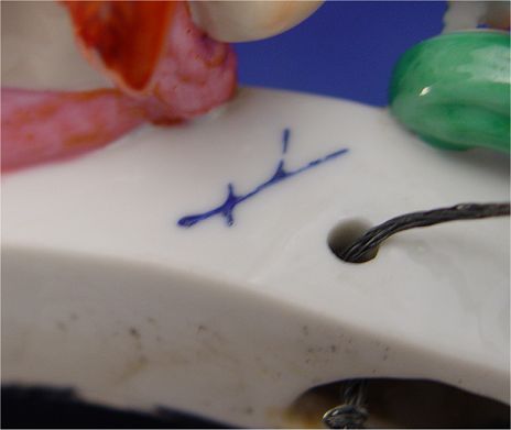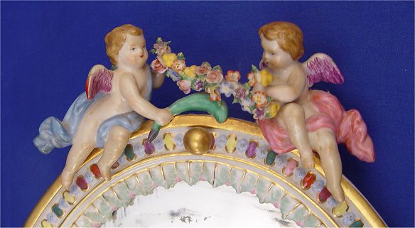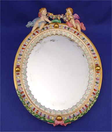 CHERUBIC PORCELAIN FRAMED MIRROR: 14'' x 10'', oval shape.