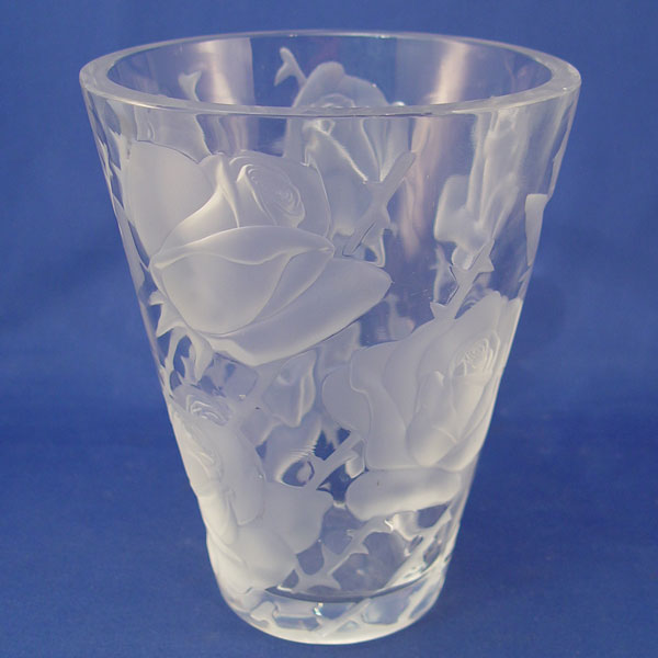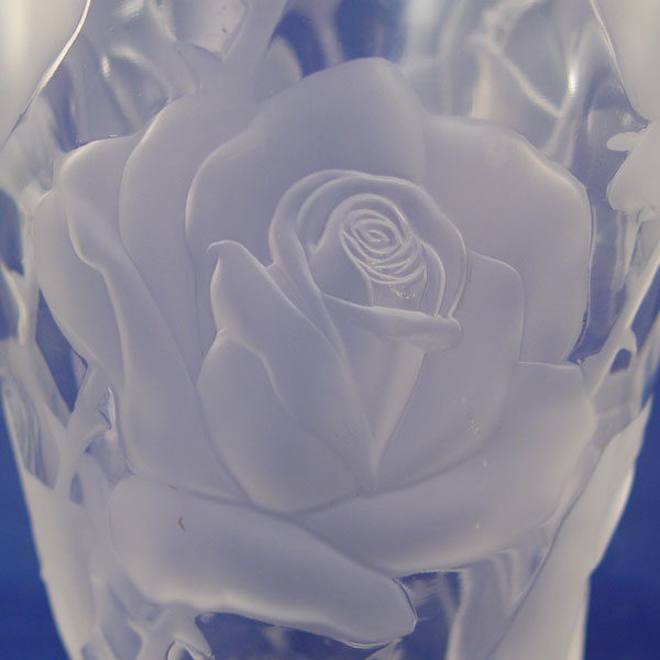 LALIQUE FRENCH CRYSTAL ROSE VASE: Deep roses, signed in script ''Lalique France'', 9 1/4'' h. 7 1/2'' dia.