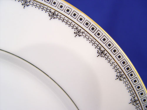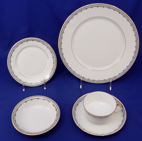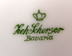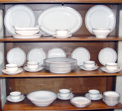 LEH SCHERZER BAVARIAN FINE CHINA: Pattern 9446, black on white design. 43 piece service for 8 to include 8 dinner plates, 6 bread plates, 8 dessert bowls, 8 cups and 8 saucers. Serving pieces include a 13 3/4'' platter, large vegetable bowl and small serving bowl.