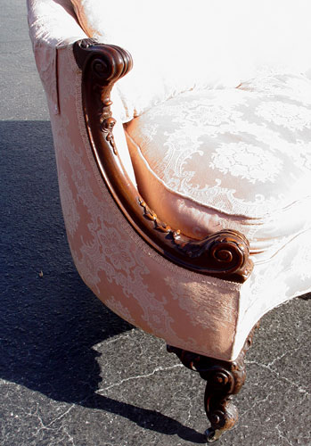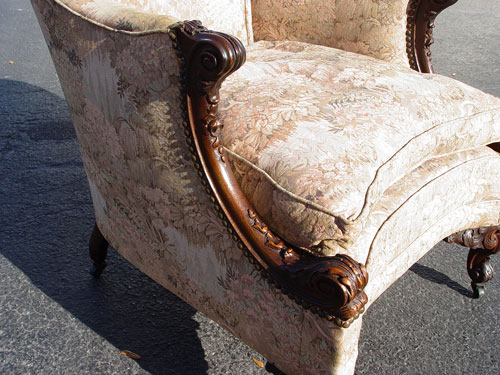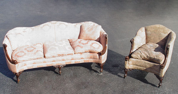 TURN OF THE CENTURY FRENCH CARVED SOFA & CHAIR: Carved mahogany frames, the back curves around to the form the arms. Three cushion sofa, 34''h., 81''l, 34'' deep. The matching chair is upholstered in tapestry fabric.