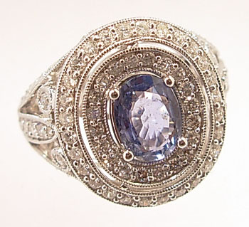 2.51ct CEYLON SAPPHIRE & DIAMOND RING: 18k white gold diamond encrusted ring centered by an approx. 1.40ct Ceylon sapphire, approx. 1.11ctw of round diamonds, size 7, 9.6 grams. Est. $800/1000**