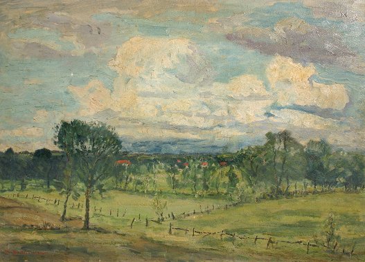 BERTLESMANN, Walter, (German, 1877-1963): ''Blick Ins Land'' Panoramic Landscape ''View in the Country'', O/B, 18 3/4'' x 26 3/4'', signed, labeled verso, worn frame, 21 1/2'' x 29 1/2''. Several minor blemishes, needs cleaning.
