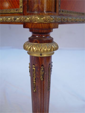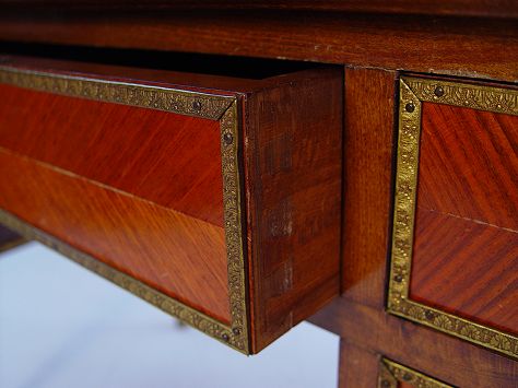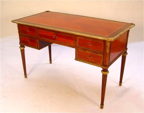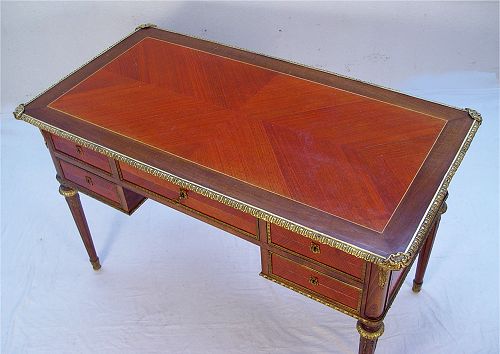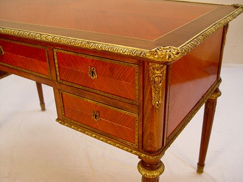 SORMANI QUALITY FRENCH ORMOLU WRITING TABLE: Matchbook veneers, rich in ormolu, fluted legs. 30''h. x 48'' x 25''