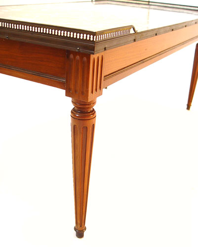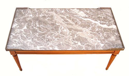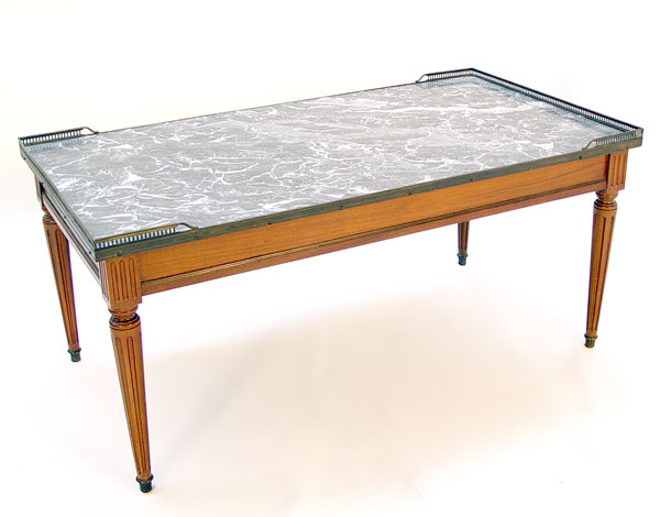 FRENCH MARBLE TOP COCKTAIL / COFFEE TABLE: Gray marble on mahogany table, reticulated gallery. Reeded legs. 18 1/4'' x 41 1/2'' x 22 1/2''.