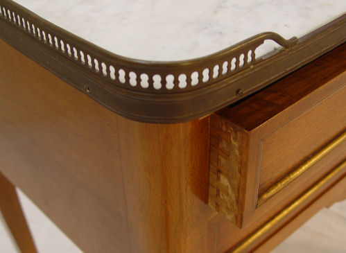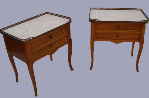 PAIR OF MARBLE TOP FRENCH STYLE SIDE TABLES: Brass gallery, white marble, 2 drawers. 24''h. x 23'' x 15''. Ca. mid 20th C.