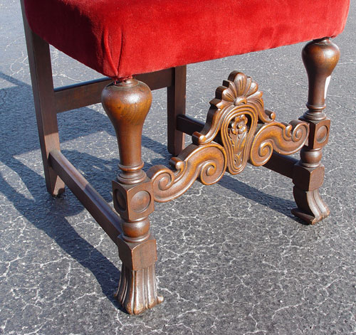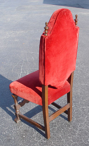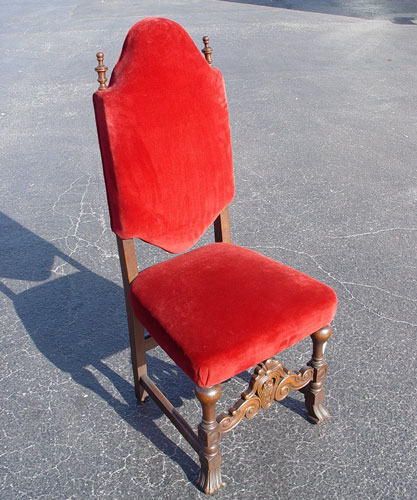 SPANISH CARVED MAHOGANY SIDE CHAIR: Carved stretcher connects Spanish feet. Seat and back upholstered in rich red with the arched high back flanked by finials. 46''h. x 19'' x 18''.