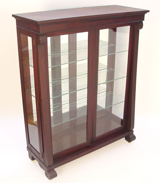 MAHOGANY EMPIRE CHINA CURIO DISPLAY CABINET: Manufactured by Cowan. Empire style, overhanging top, scrolled feet. Mirror back interior with adjustable glass shelves. 50 1/2'' x 48'' x 15''.