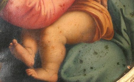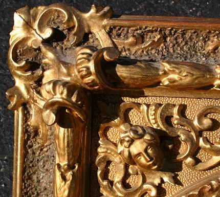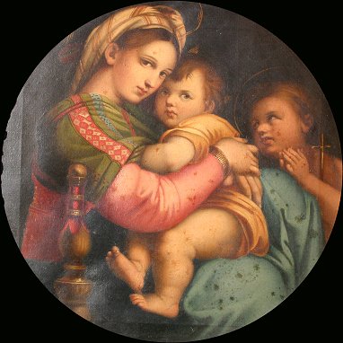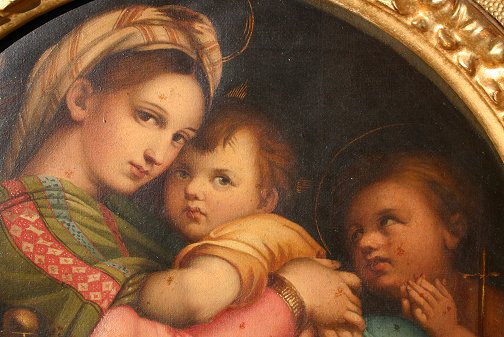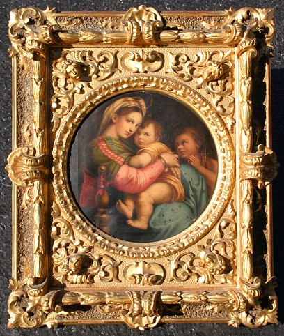 MADONNA DELLA SEGGIOLA AFTER RAPHAEL, Oil/C: Circa 1900, 12'' x 12'', highly ornate gilded and carved period frame with masquerons, shell, and foliate motif, minor wear, 24'' x 20''. Small puncture, needs cleaning.