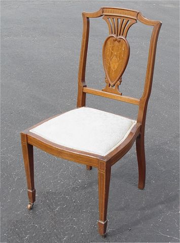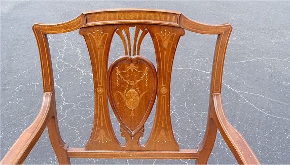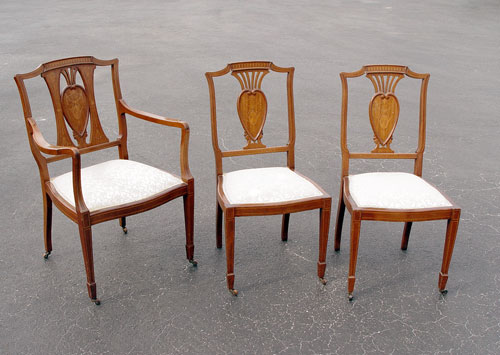 SET OF 3 MOTHER OF PEARL INLAY CHAIRS: Two side chairs and one arm chair, inlaid with mother of pearl and string boxwood, pierce carved backs. 35''h. x 21 1/2'' x 19''.