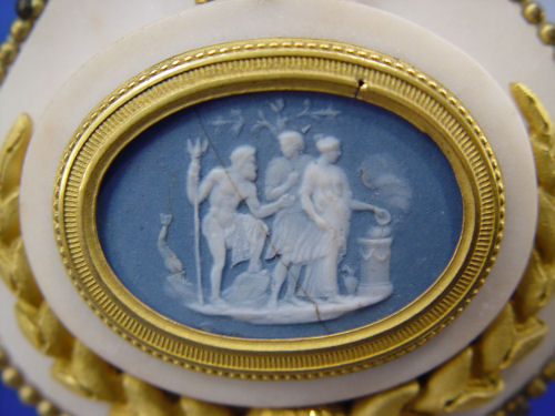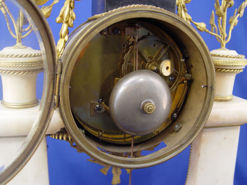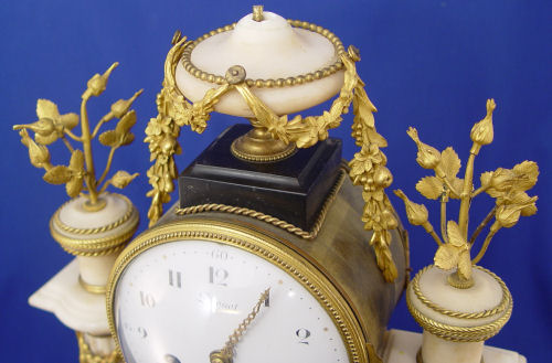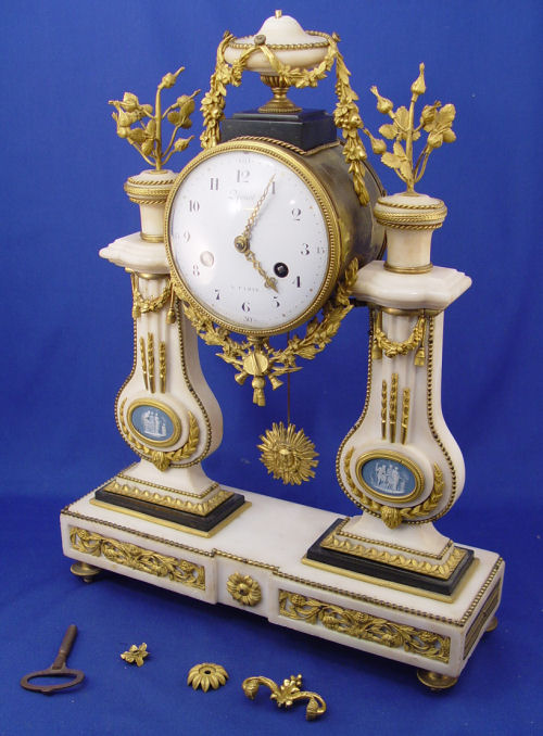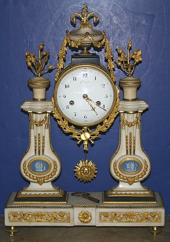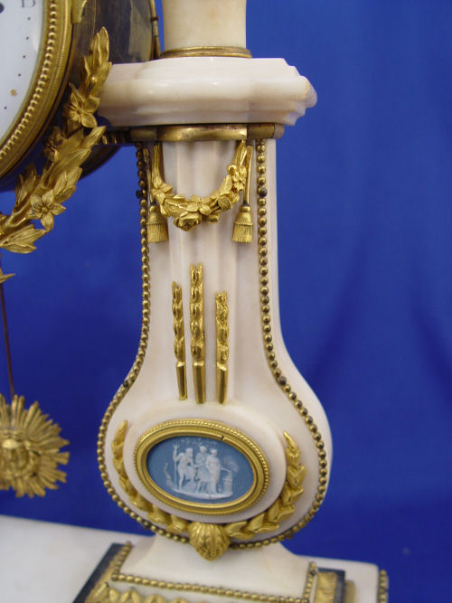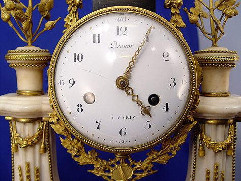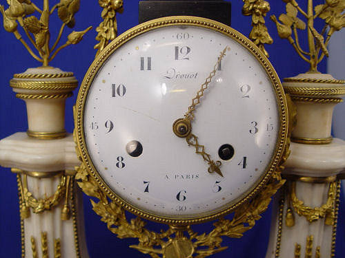 FRENCH MARBLE PILLAR CLOCK: The enamel dial is signed Drouot and Paris. White marble with ormolu mounts and jasper medallions. Pendulum included. 19''h. x 13 3/4' x 4 1/4''. Finial needs soldering repair.