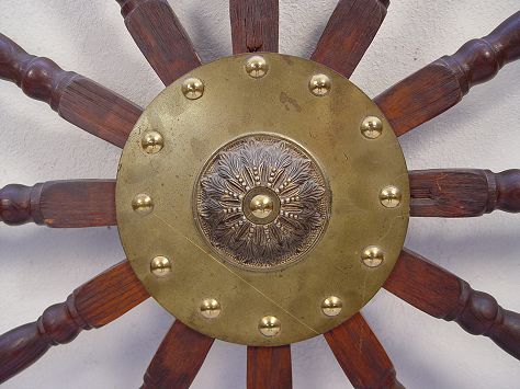 HUGE 19TH CENTURY SHIPS WHEEL: 5 ft 7 in. diam. With 12 spokes centering an ornate brass hub.