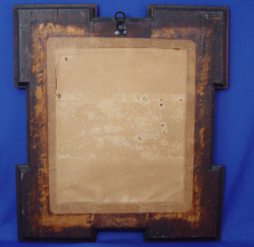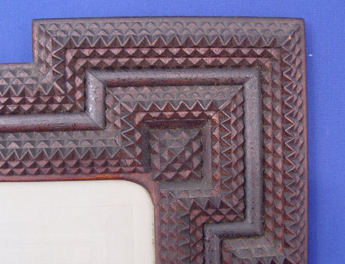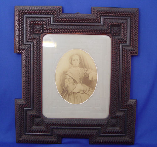 19th C TRAMP ART FRAME: Hand crafted wood frame with Victorian portrait photo and mat. 17'' x 15'' overall, will support a 10'' x 8'' picture.