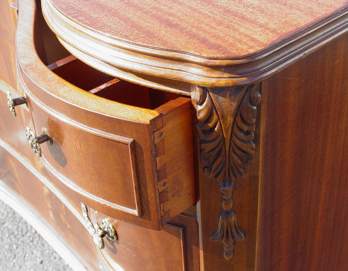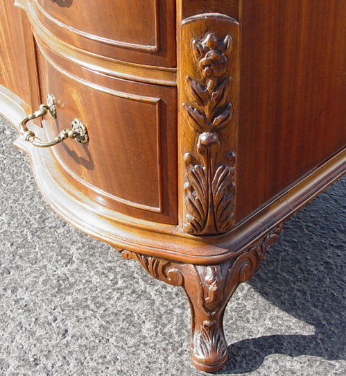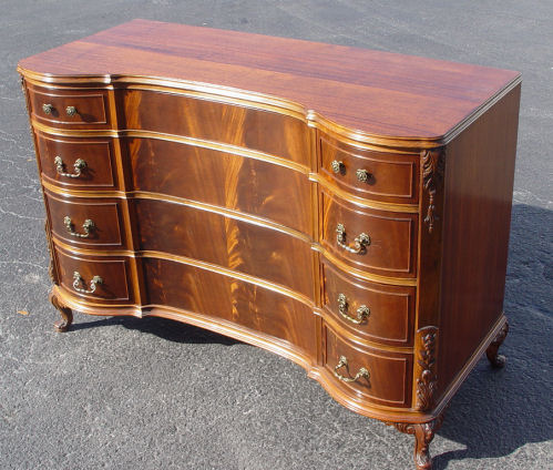 HIGH QUALITY FLAME GRAIN MAHOGANY DRESSER: 4 drawer chest with the center curved inward, carved feet, brass pulls. 35''h. x 48 3/4'' x 22''