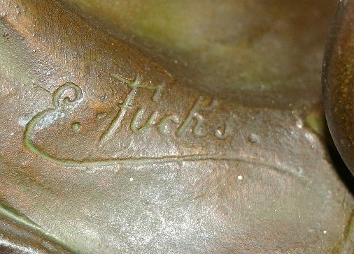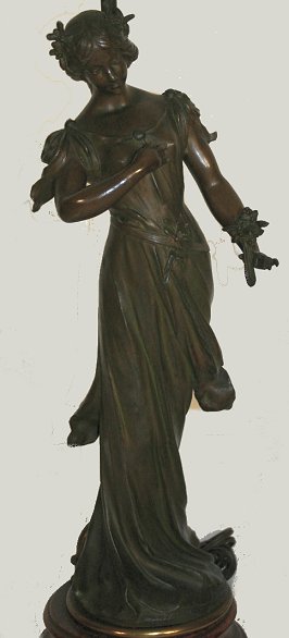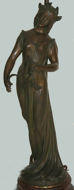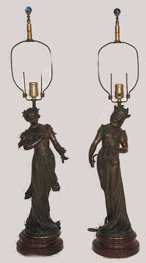 PAIR OF PERIOD NOUVEAU FIGURAL SPELTER LAMPS BY EMILE FUCHS: ''Le Gui'' and ''Le Houx'', 19'' figure, 36'' total with faux marble plinth and harp.