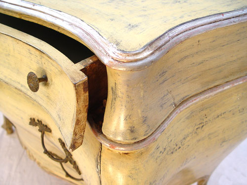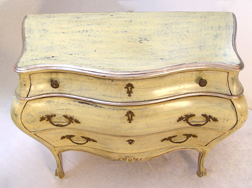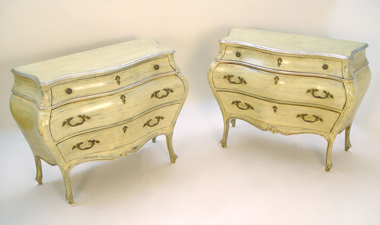 PAIR OF FRENCH STYLE BOMBAY COMMODES: Painted finish with silvered embellishment, 3 drawers, 39''h. x 32 1/2'' x 16 1/2''. Purchased at Stern's Bros., New York.