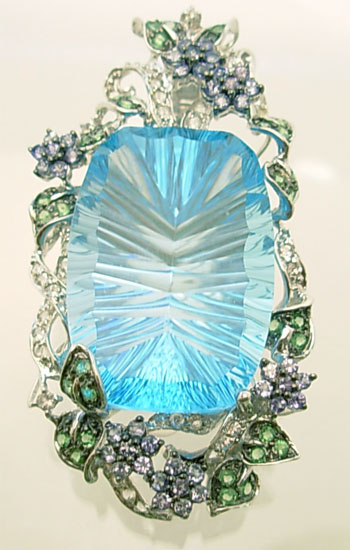 104CTW FANTASY TOPAZ, GARNET AND TANZANITE PENDANT: 14k white gold pendant starring a 101.26ct blue topaz cushion cut with fantasy bottom, framed in flowers and ribbons set with .71ctw white topaz, .88ctw tsavorite garnet and 1.23ctw tanzanite. Bail with enhancer clasp will fit up to a 10mm chain or strand of pearls, approx. 2 1/4''l., 35.80 grams. Est. $700/900**