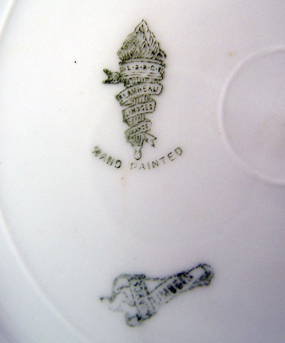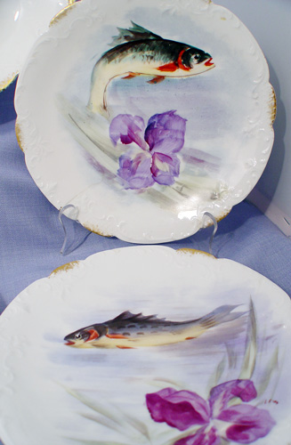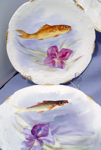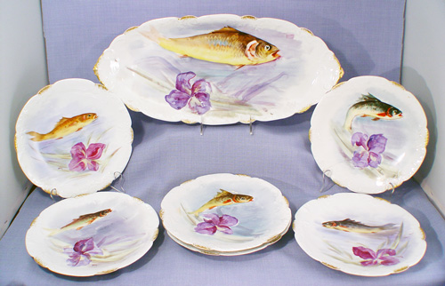 FRENCH LIMOGES FISH PLATTER AND 4 PLATES: Flambeau China Ca. 1890's - 1914. Hand painted fish and orchid design. The platter is 19'' long x 8''. The plates 8 1/2'' dia. 2 extra plates with chip or crack will be included.