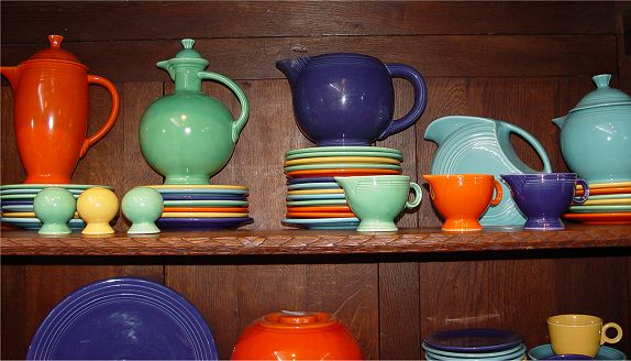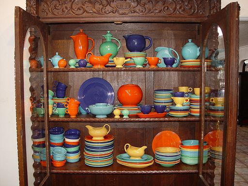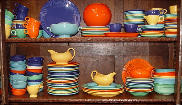 HUGE LIFETIME COLLECTION OF VINTAGE FIESTA DINNERWARE IN ORIGINAL COLORS: 241 pieces to include Serving pieces first- red coffee server, large red covered jar, green Carafe, dark blue ice pitcher, large turquoise teapot, turquoise disc water pitcher, 2 turquoise and 1 yellow salt and pepper, larger red and dark blue shakers, 2 yellow 1 red and 1 green 12.5'' oval platter, 9 1/2'' turquoise platter, 2 yellow and 1 red gravy boats, yellow stick handle creamer, red utility tray, 3 dark blue 1 yellow 1 red and 1 green ring handle creamers, turquoise covered sugar, dark blue and turquoise sugars without lids, turquoise casserole dish without lid. There are 2 yellow, 2 green, 1 red, 2 dark blue, 3 turquoise, and 1 ivory low soup bowls. Nappys in the 8 1/2'' size ar 2 green, 1 turquoise, 1 yellow, and 1 red. Deep soups are 1 dark blue, 1 turquoise. Lots of fruit bowls include 10 turquoise, 5 red, 2 green, 7 dark blue, 1 yellow, and 1 ivory. The ring handle teacups are 3 red, 4 green, 5 dark blue, 6 turquoises,