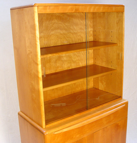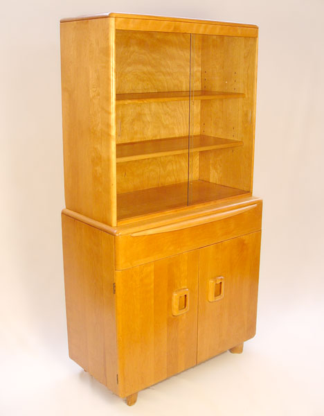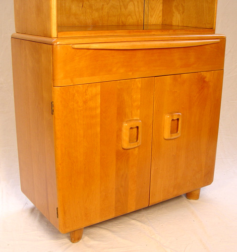 HEYWOOD WAKEFIELD 2 PART CHINA HUTCH: The upper section has adjustable shelves behind sliding glass doors, the back is stamped M175. The lower section has full length drawer over cabinet doors, the drawer bears the Heywood Wakefield brand. The server bottom is 32 1/2''h. x 33 1/2''w. The hutch top is 32''h. x 32'' wide.