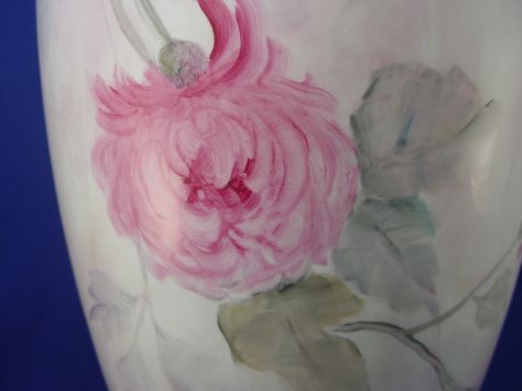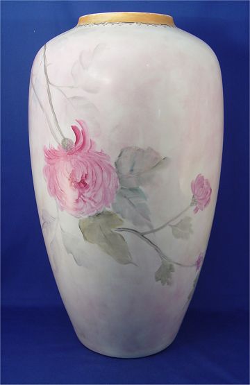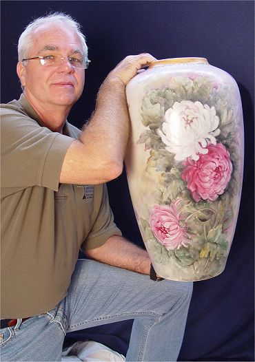 TALL HAND PAINTED HEINRICH GERMAN PORCELAIN VASE: 22''h., artist signed by Sue Guerry. Slightly visible hairline on the underside.