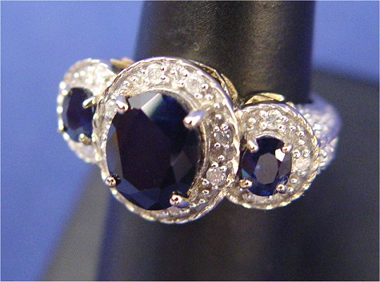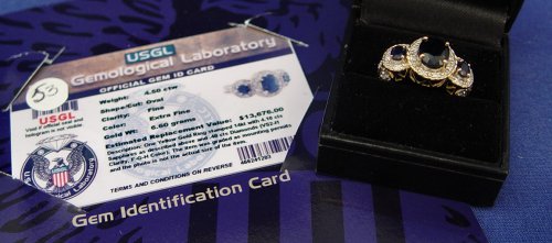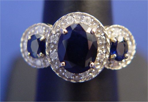 4.5CTW SAPPHIRE & DIAMOND RING: Oval cut sapphire of 4.10ct, fine color and clarity, measuring approx. - center stone 7.9 x 10 x 5.5mm, side stones approx. 4.8-5.1 x 3.9-4 x 2.2-2.3mm, set in 14k yellow gold ring with approx. 40pts total of diamonds, size 7.25, approx. 6.6 grams. With current US Gemological Laboratory Gem ID card, $13,676 estimated replacement value, sold at no reserve.