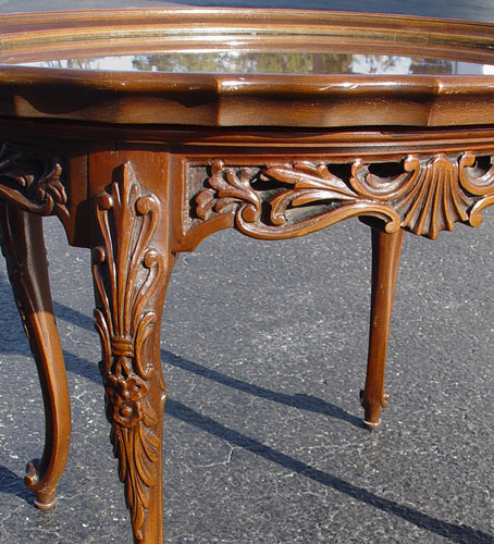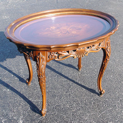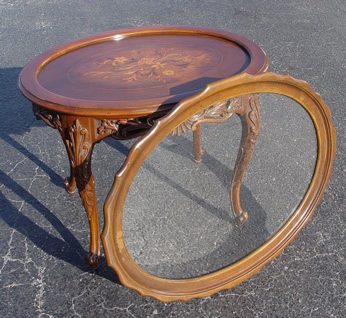 MARQUETRY INLAY TEA TABLE WITH LIFT OFF TRAY: Carved and inlay with glass tray framed in mahogany. 30''h. x 22 1/2'' x 29 1/2''.