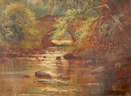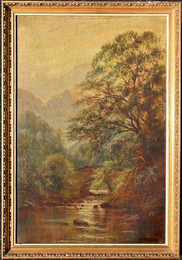 GRAHAM, F., (American, 19/20th C): Mountain Valley Landscape with Stone Bridge and Figures, O/C, 24'' x 16'', gilt frame with wear, 26'' x 18''. Needs cleaning, small fleck, mild cracklure. Est. $300/500**
