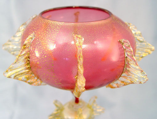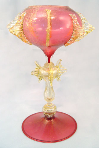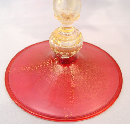 VENETIAN CRANBERRY AVENTURINE ART GLASS: Tall vase on hollow stem and round base. Gold flecks in the applied clear decoration and in the cranberry. Free of chips or cracks. 9 3/4''
