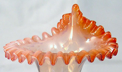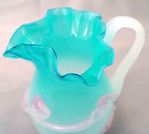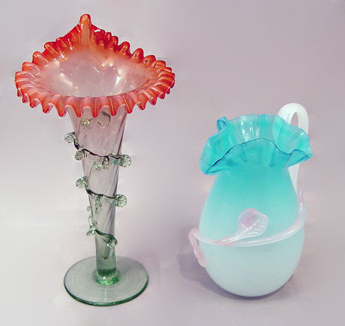 2 PIECE APPLIED DECORATION VICTORIAN ART GLASS: 1)Jack in the Pulpit green to cranberry vase, 8 1/2'', the bottom is green, the top is cranberry opalescent, this piece fluoresces under a black light. 2) Opaque pitcher in blue fades to white, 5 3/4''. Both with ruffled rims and applied glass decorations. Free of chips or cracks.